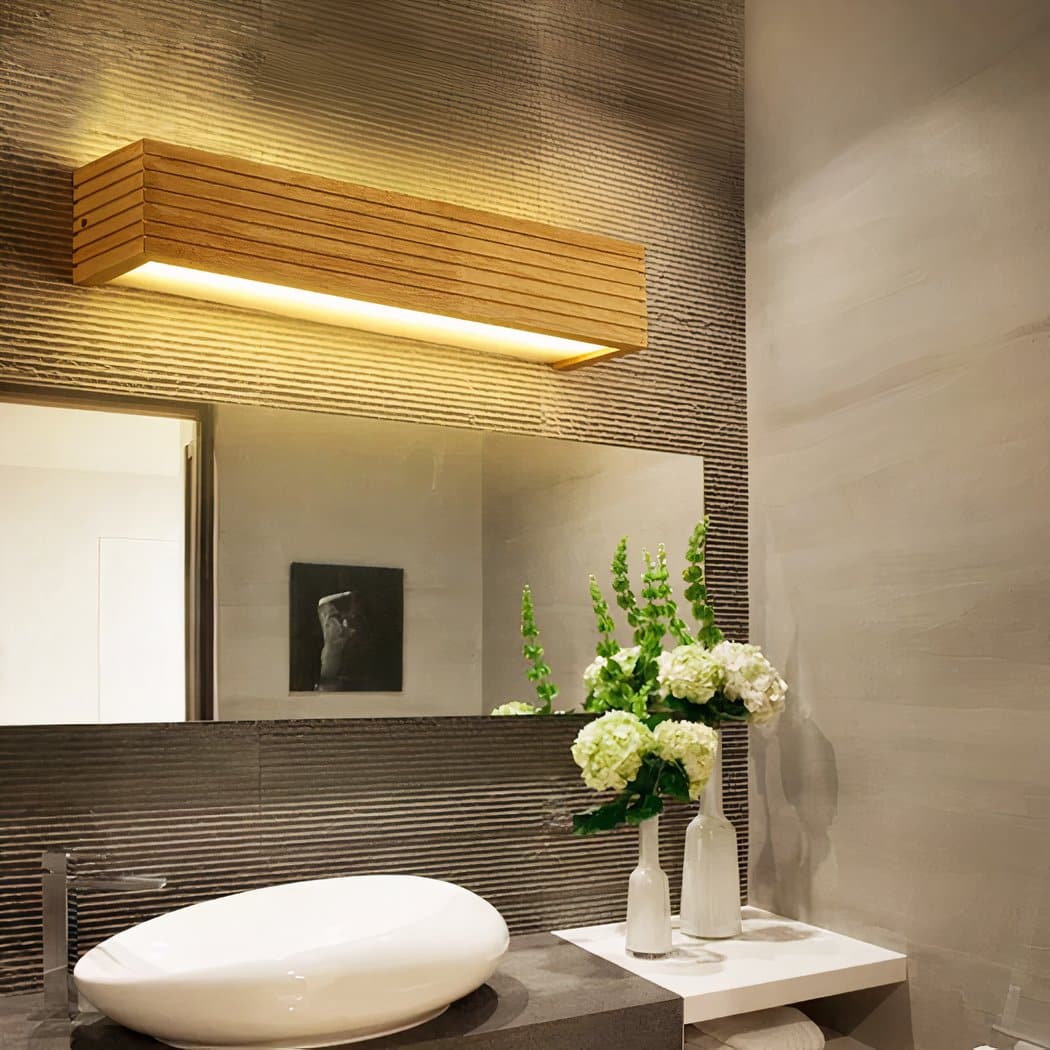 This rectangular wooden bathroom wall light is an imposing design element that will immediately catch the eye and add a touch of elegance to your decor.