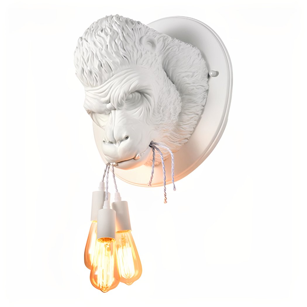 The wall lamp features a gorilla head holding three bulbs in its mouth, held in place by a string. These lamps provide bright, direct illumination, allowing maximum diffusion of light throughout the space.