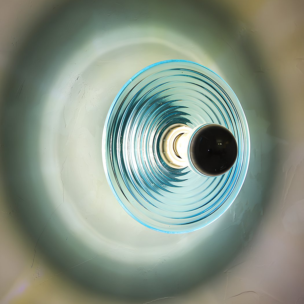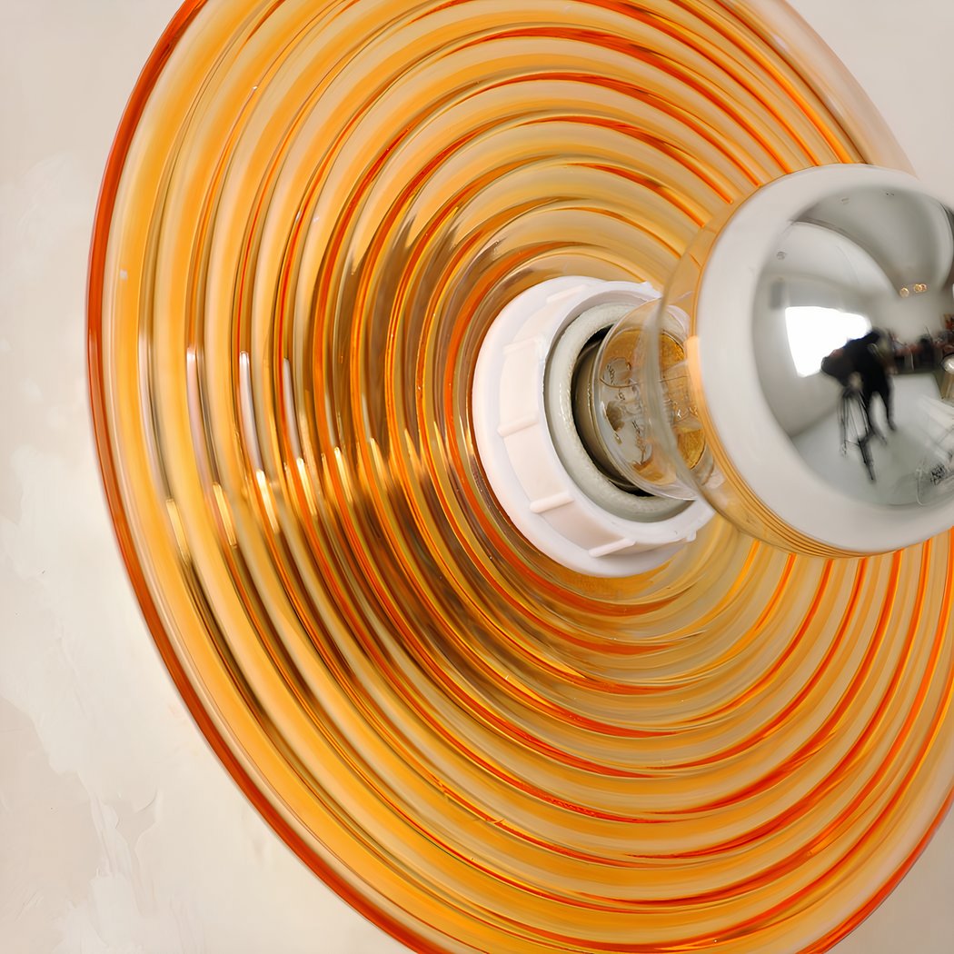 The colored glass circle creates a unique lighting effect on the wall once the bulb is switched on. Light diffuses through the colored glass, creating reflections and shadows that add a warm atmosphere to the room.